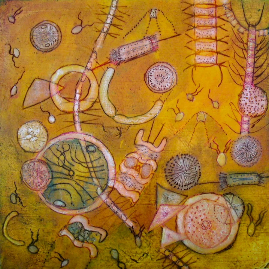 Below are other plankton works. Fluid acrylics and pencil on mylar mounted on paper and adhered to a cradle board. 12x12 inches.
