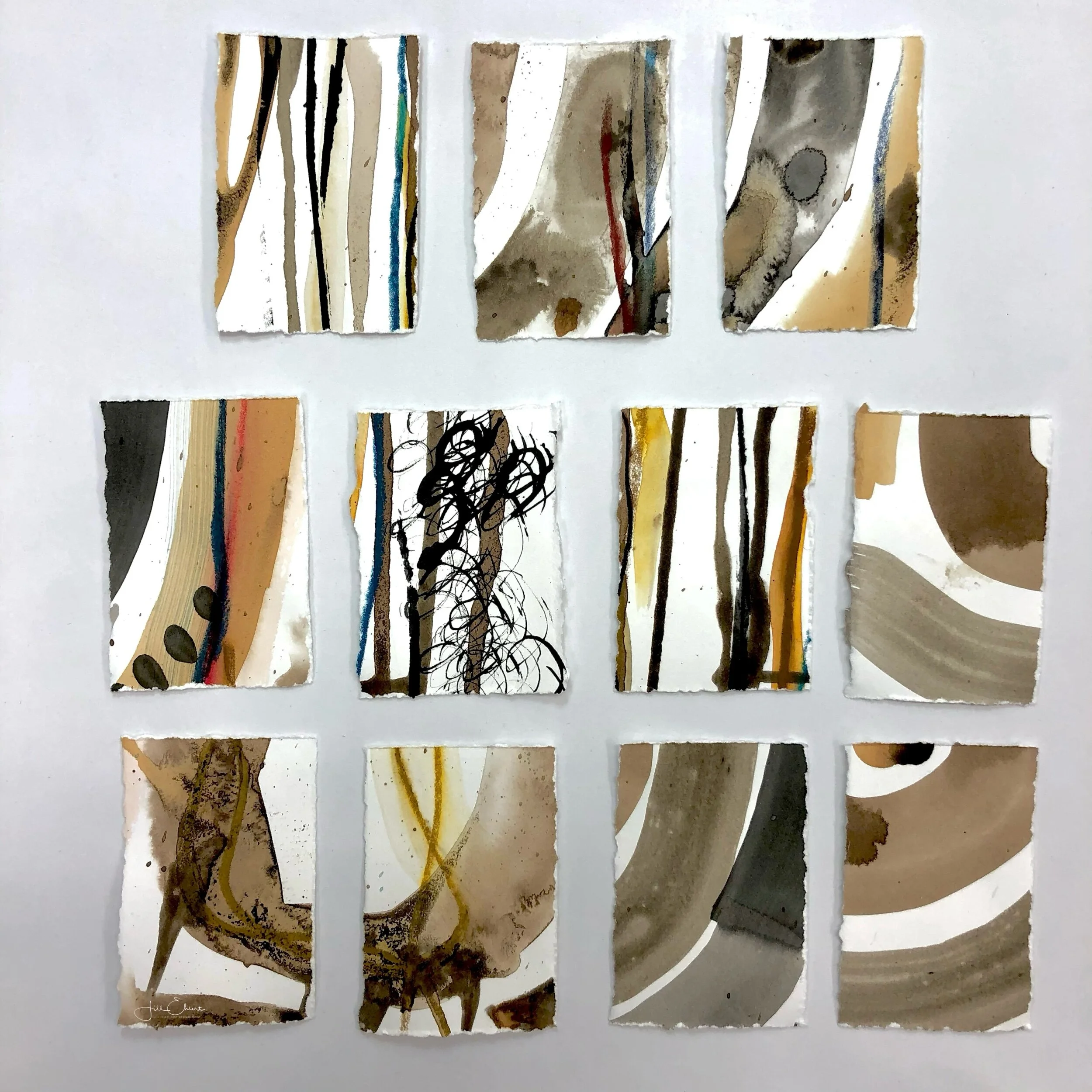I began this project, by first creating a background on Stonehenge paper, with marks, shapes and lines. I employed a combination of India ink, my home-made Walnut and Acorn inks and ArtGraf Viarco six color Carbon disc set. Once dry, I cut this large sheet, into 2”X3” rectangles, which you can see below.