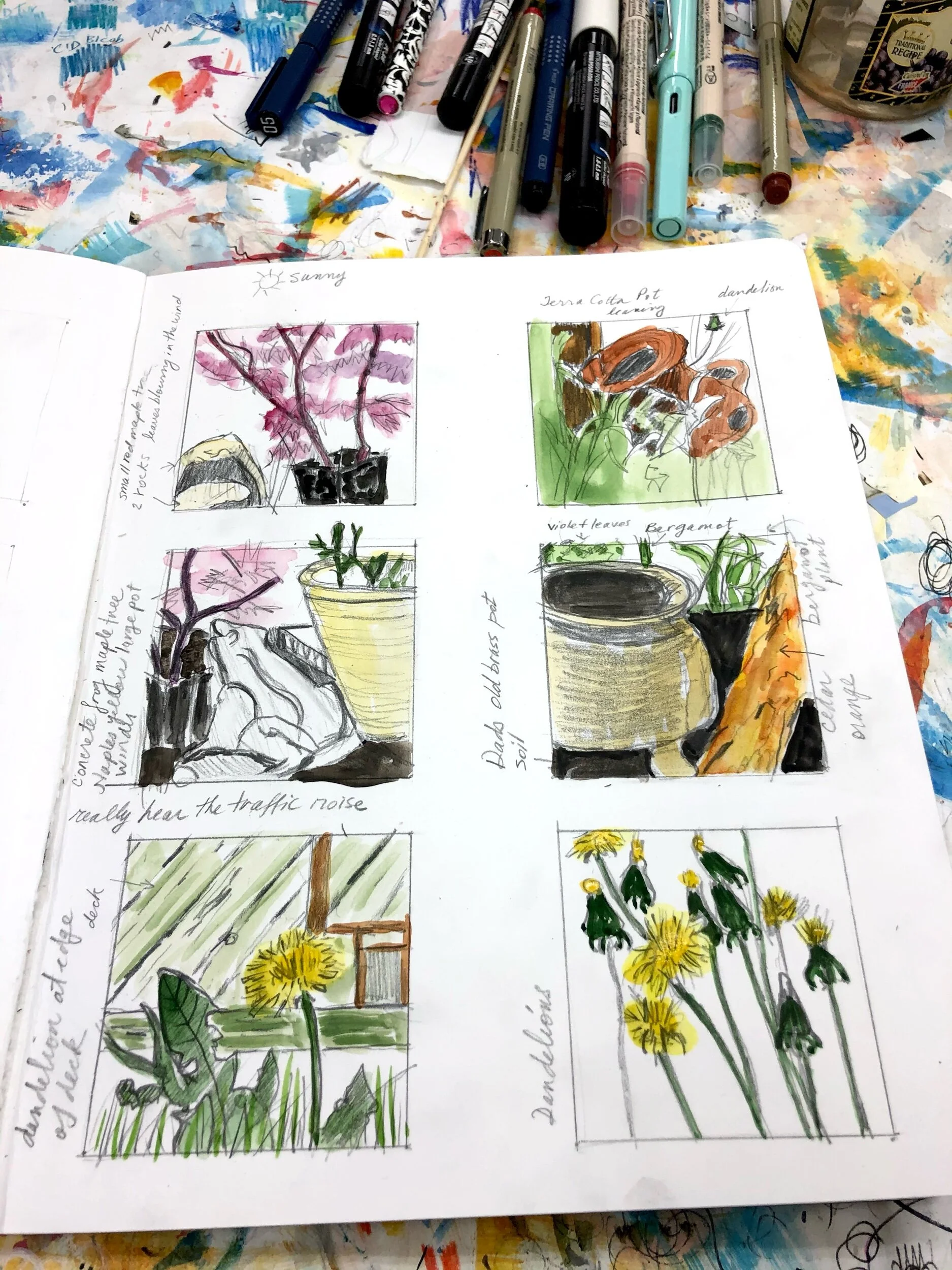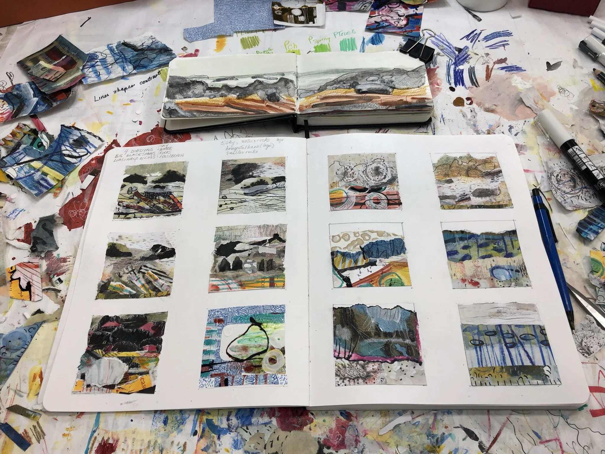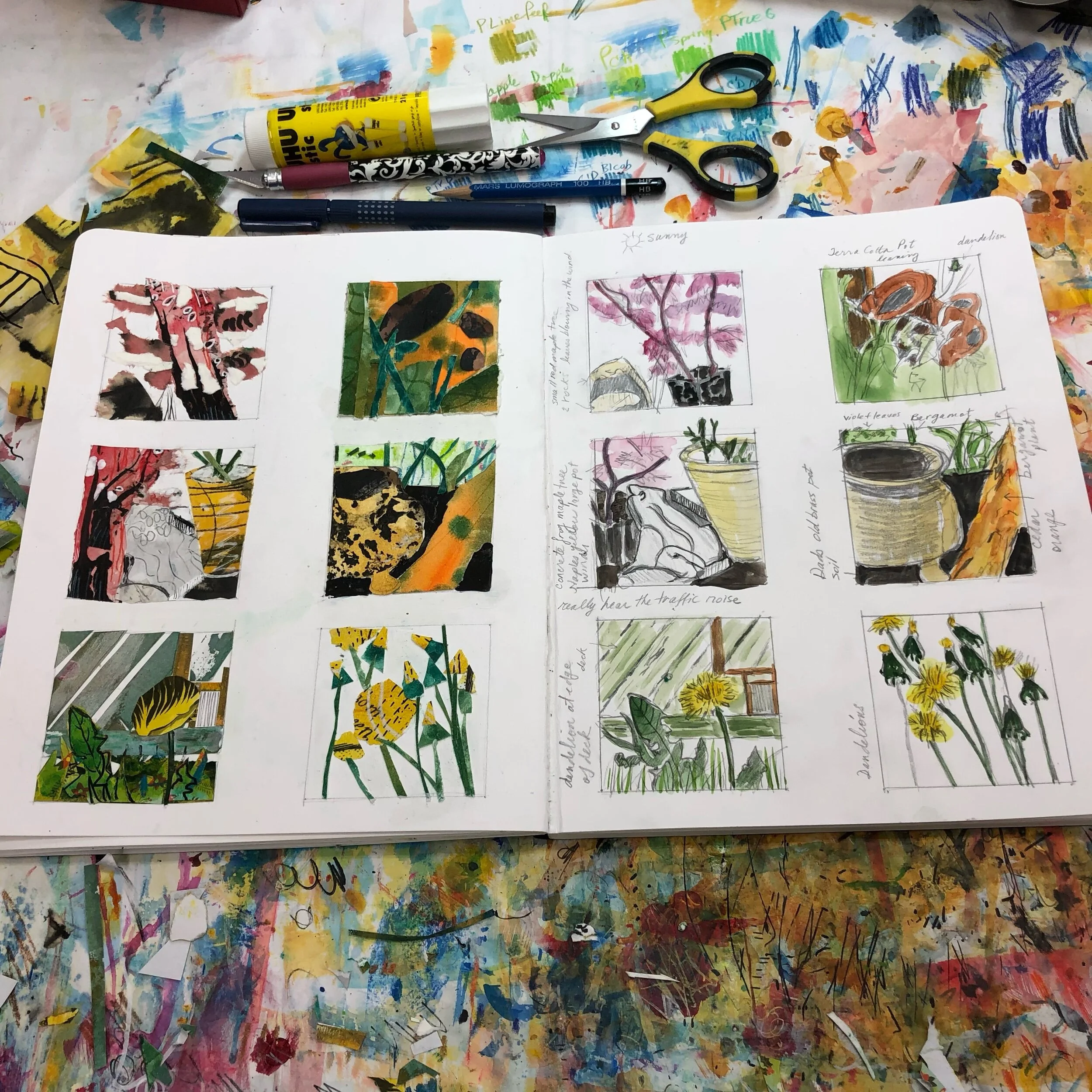 Mixed media thumbnail collages, working from sketches of the garden.